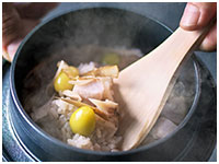 - お食事(鉄板羽釜炊き込みご飯、伊勢海老の赤出汁、香の物)